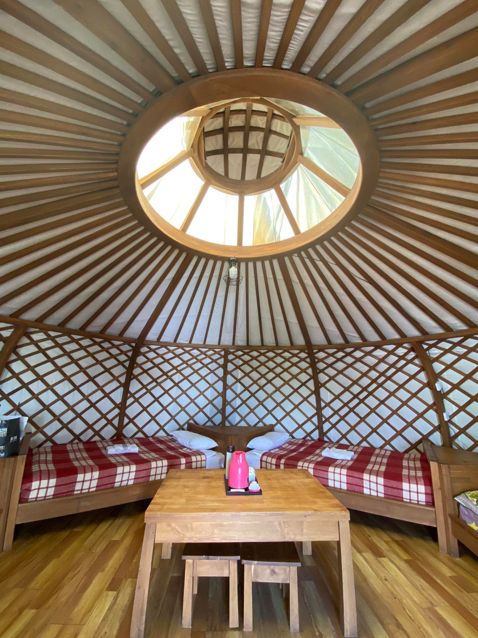 Đây là Ger du lịch có kính lấy ánh sáng ở trên, Ger nhà dân rất kín, có thêm ống khói, bếp sưởi ấm, nấu ăn và ngủ trong lều luôn. Đèn dùng năng lượng mặt trời
