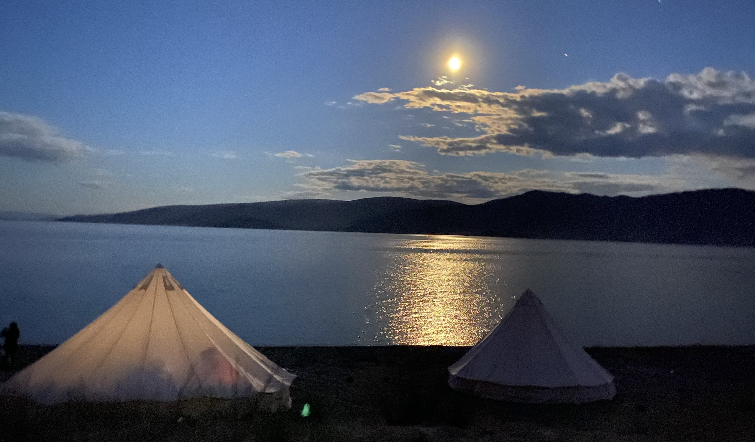 Đêm hôm đó bên hồ, trăng 13 sáng thật đẹp, 11h đêm chuẩn bị đi ngủ thì chớp được khoảnh khắc ánh trăng dát vàng xuống hồ lóng lánh, với nền là bãi cát và những chiếc lều trắng bật đèn, đẹp như một bức tranh.